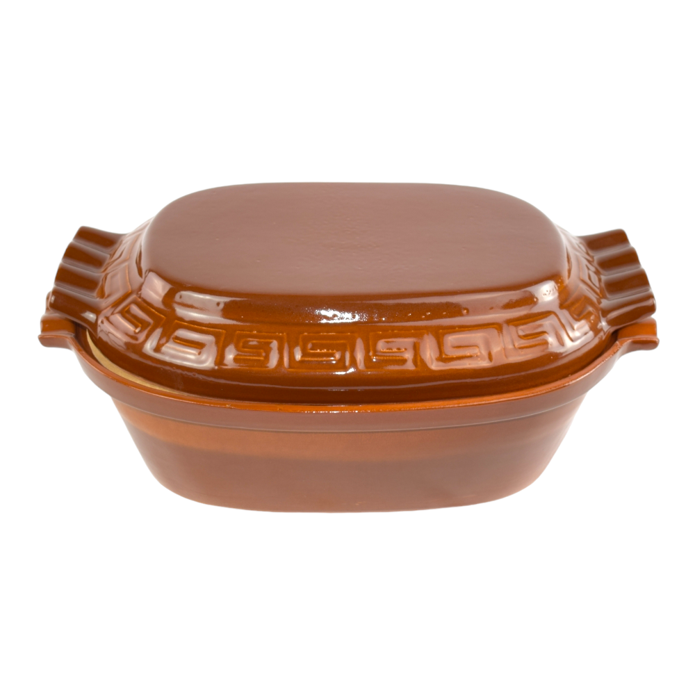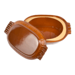 Vas românesc smălțuit din ceramică, realizat manual din lut de calitate superioară. Poate fi folosit în cuptor electric, pe gaz sau cu lemne, ideal pentru preparate tradiționale precum sarmalele și tocănițele. Rezistent la temperaturi ridicate, îmbină tradiția cu funcționalitatea, putând fi folosit atât pentru gătit, cât și ca decor autentic în bucătărie.